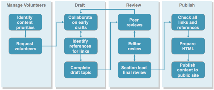 The Usability BoK content is created and managed initially in a wiki (draft.usabilitybok.org - login required), shared by over 500 volunteers. The wiki provides a lot of flexibility when adding content to existing topics and allowing contributors to identify new topics. The process for contribution is: